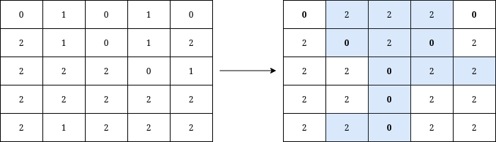 Input: grid = [[0,1,0,1,0],[2,1,0,1,2],[2,2,2,0,1],[2,2,2,2,2],[2,1,2,2,2]]